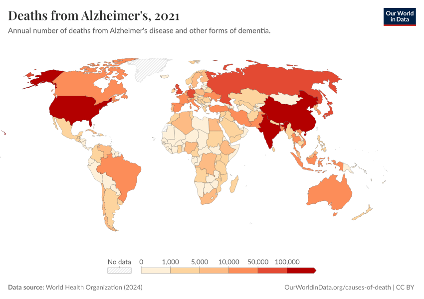 “Data Page: Deaths from Alzheimer's”, part of the following publication: Esteban Ortiz-Ospina and Max Roser (2016) - “Global Health”. Data adapted from World Health Organization. Retrieved from https://index-dataset-dim.owid.pages.dev/grapher/deaths-from-alzheimers-other-dementias [online resource]How to cite this data