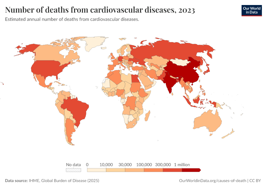 “Data Page: Number of deaths from cardiovascular diseases”, part of the following publication: Esteban Ortiz-Ospina and Max Roser (2016) - “Global Health”. Data adapted from IHME, Global Burden of Disease. Retrieved from https://index-dataset-dim.owid.pages.dev/grapher/deaths-from-cardiovascular-disease [online resource]How to cite this data