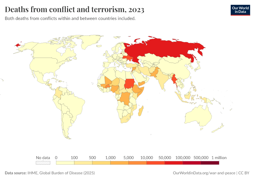 “Data Page: Deaths from conflict and terrorism”, part of the following publication: Esteban Ortiz-Ospina and Max Roser (2016) - “Global Health”. Data adapted from IHME, Global Burden of Disease. Retrieved from https://index-dataset-dim.owid.pages.dev/grapher/deaths-from-conflict-and-terrorism [online resource]How to cite this data