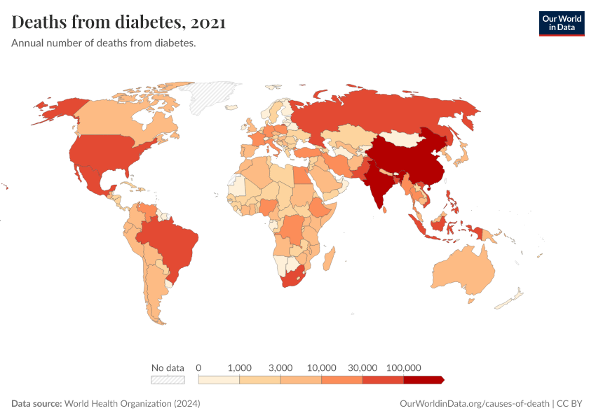“Data Page: Deaths from diabetes”, part of the following publication: Esteban Ortiz-Ospina and Max Roser (2016) - “Global Health”. Data adapted from World Health Organization. Retrieved from https://index-dataset-dim.owid.pages.dev/grapher/deaths-from-diabetes-ghe [online resource]How to cite this data