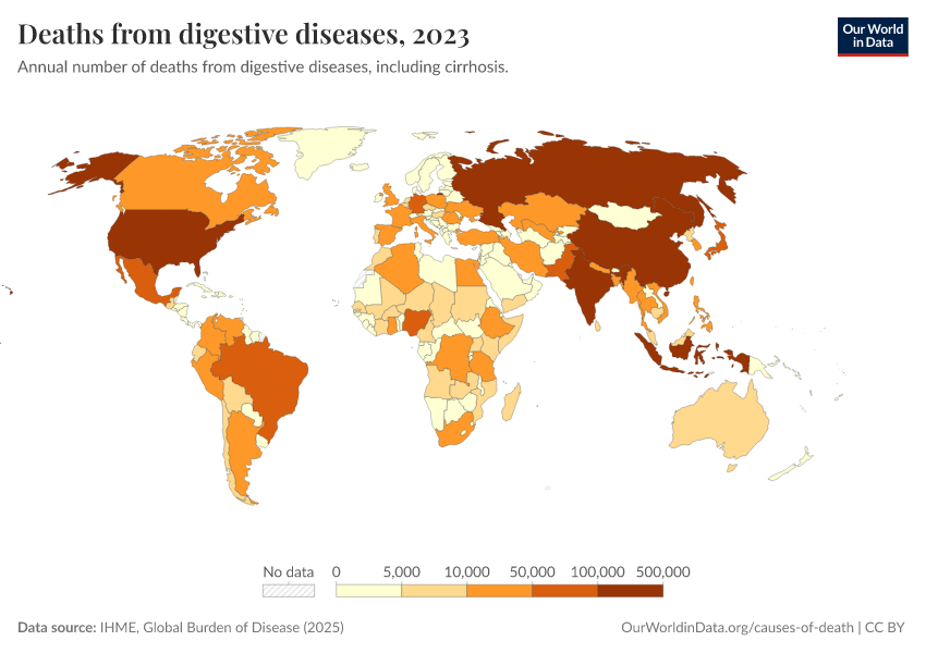 “Data Page: Deaths from digestive diseases”, part of the following publication: Esteban Ortiz-Ospina and Max Roser (2016) - “Global Health”. Data adapted from IHME, Global Burden of Disease. Retrieved from https://index-dataset-dim.owid.pages.dev/grapher/deaths-from-digestive-diseases [online resource]How to cite this data