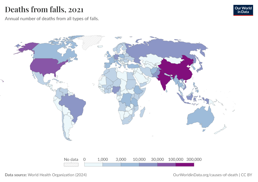 “Data Page: Deaths from falls”, part of the following publication: Esteban Ortiz-Ospina and Max Roser (2016) - “Global Health”. Data adapted from World Health Organization. Retrieved from https://index-dataset-dim.owid.pages.dev/grapher/deaths-from-falls [online resource]How to cite this data