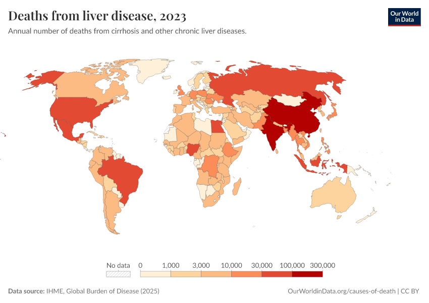 “Data Page: Deaths from liver disease”, part of the following publication: Esteban Ortiz-Ospina and Max Roser (2016) - “Global Health”. Data adapted from IHME, Global Burden of Disease. Retrieved from https://index-dataset-dim.owid.pages.dev/grapher/deaths-from-liver-disease [online resource]How to cite this data