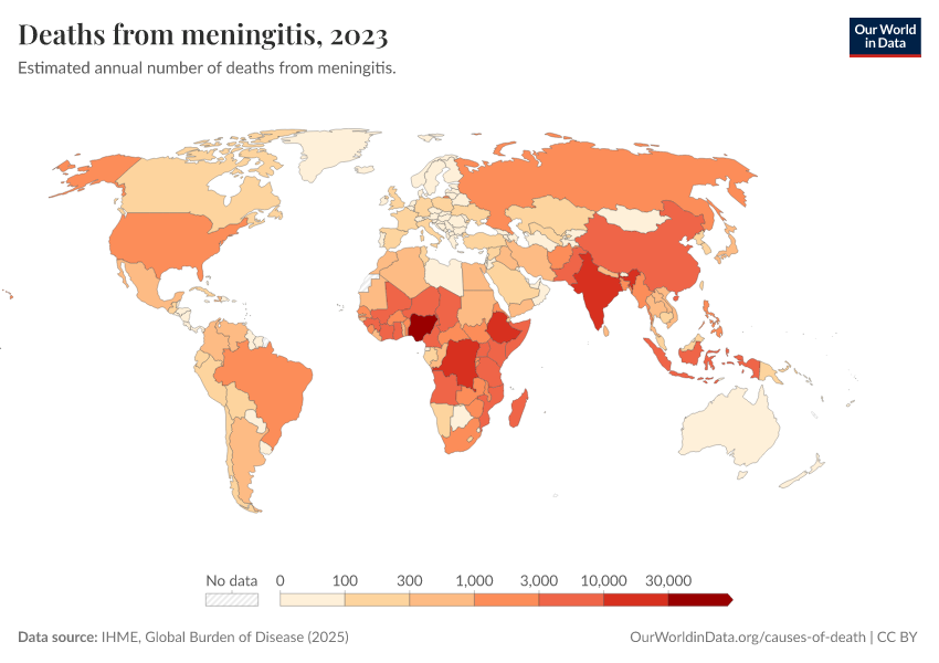 “Data Page: Deaths from meningitis”, part of the following publication: Esteban Ortiz-Ospina and Max Roser (2016) - “Global Health”. Data adapted from IHME, Global Burden of Disease. Retrieved from https://index-dataset-dim.owid.pages.dev/grapher/deaths-from-meningitis [online resource]How to cite this data