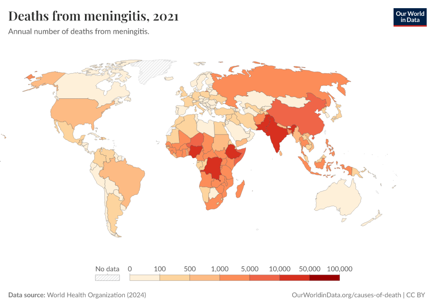 “Data Page: Deaths from meningitis”, part of the following publication: Esteban Ortiz-Ospina and Max Roser (2016) - “Global Health”. Data adapted from World Health Organization. Retrieved from https://index-dataset-dim.owid.pages.dev/grapher/deaths-from-meningitis-ghe [online resource]How to cite this data
