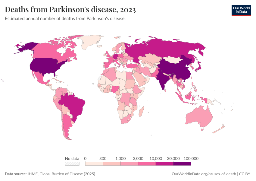 “Data Page: Deaths from Parkinson's disease”, part of the following publication: Esteban Ortiz-Ospina and Max Roser (2016) - “Global Health”. Data adapted from IHME, Global Burden of Disease. Retrieved from https://index-dataset-dim.owid.pages.dev/grapher/deaths-from-parkinsons-disease [online resource]How to cite this data