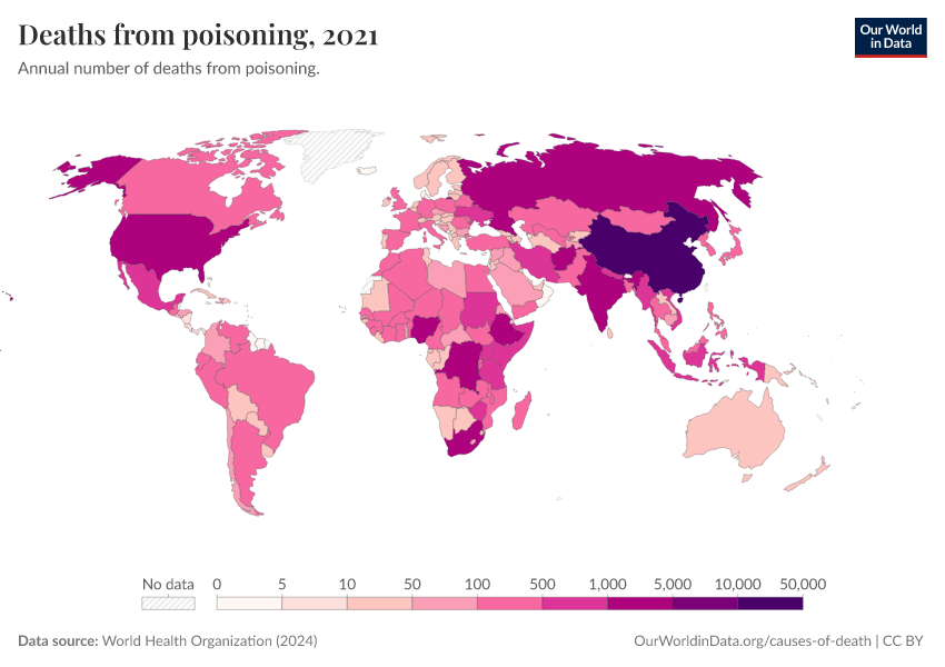 “Data Page: Deaths from poisoning”, part of the following publication: Esteban Ortiz-Ospina and Max Roser (2016) - “Global Health”. Data adapted from World Health Organization. Retrieved from https://index-dataset-dim.owid.pages.dev/grapher/deaths-from-poisonings-ghe [online resource]How to cite this data