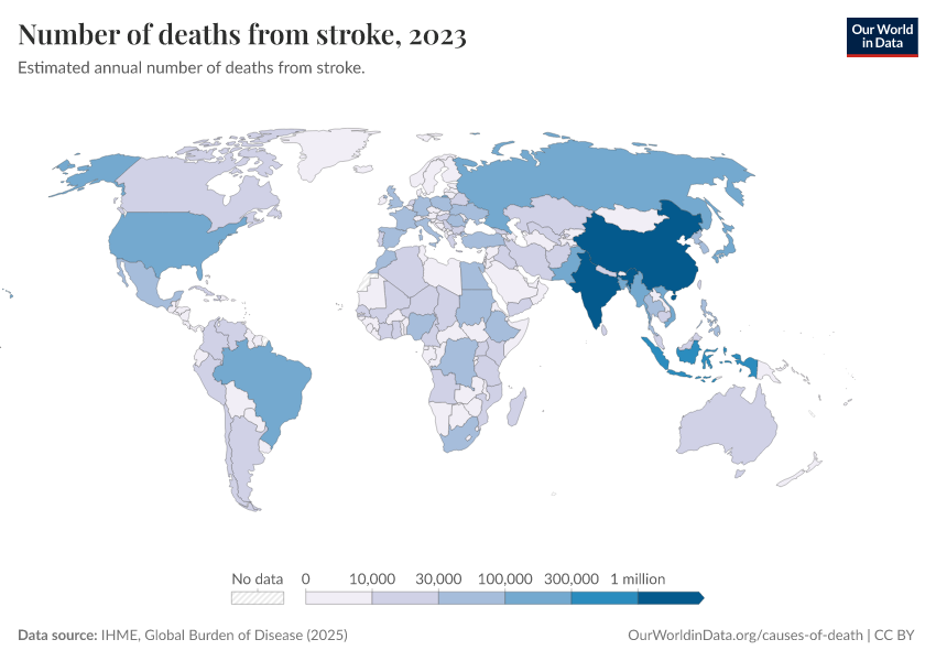 IHME, Global Burden of Disease (2024) – with minor processing by Our World in Data. “Number of deaths from stroke” [dataset]. IHME, Global Burden of Disease, “Global Burden of Disease - Deaths and DALYs” [original data]. Retrieved February 13, 2026 from https://index-dataset-dim.owid.pages.dev/grapher/deaths-from-strokes