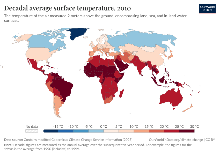 “Data Page: Decadal average surface temperature”, part of the following publication: Hannah Ritchie, Pablo Rosado, and Veronika Samborska (2024) - “Climate Change”. Data adapted from Contains modified Copernicus Climate Change Service information. Retrieved from https://index-dataset-dim.owid.pages.dev/grapher/decadal-average-surface-temperature [online resource]How to cite this data