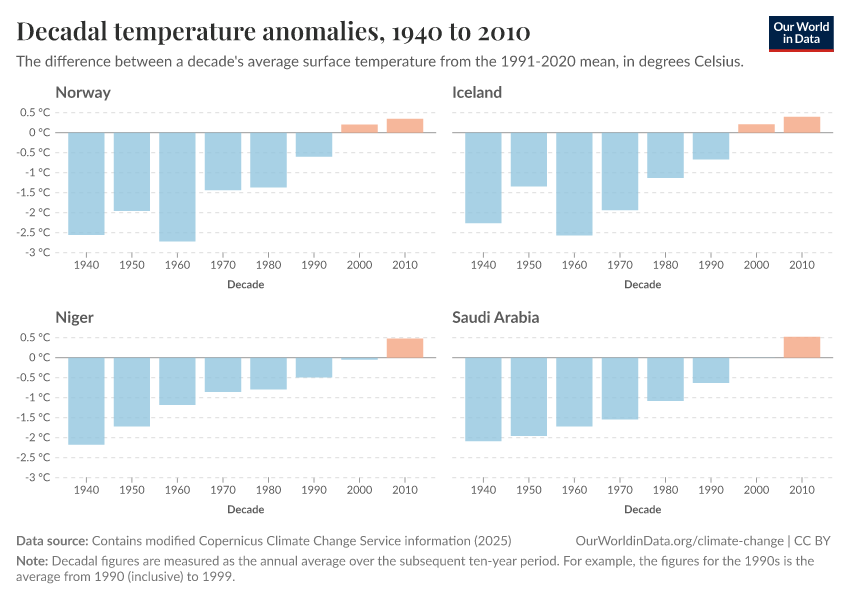 “Data Page: Decadal temperature anomalies”, part of the following publication: Hannah Ritchie, Pablo Rosado, and Veronika Samborska (2024) - “Climate Change”. Data adapted from Contains modified Copernicus Climate Change Service information. Retrieved from https://index-dataset-dim.owid.pages.dev/grapher/decadal-temperature-anomaly [online resource]How to cite this data