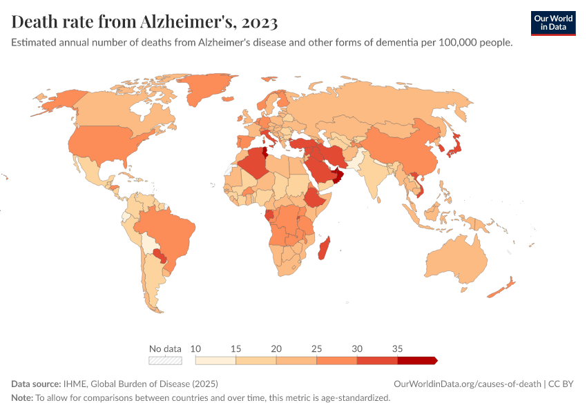 IHME, Global Burden of Disease (2024) – with minor processing by Our World in Data. “Death rate from Alzheimer's” [dataset]. IHME, Global Burden of Disease, “Global Burden of Disease - Deaths and DALYs” [original data]. Retrieved February 13, 2026 from https://index-dataset-dim.owid.pages.dev/grapher/dementia-death-rates