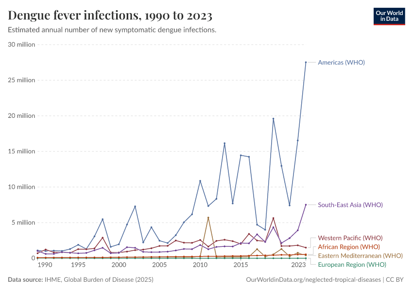 IHME, Global Burden of Disease (2024) – with major processing by Our World in Data. “Dengue fever infections” [dataset]. IHME, Global Burden of Disease, “Global Burden of Disease - Prevalence” [original data]. Retrieved February 13, 2026 from https://index-dataset-dim.owid.pages.dev/grapher/dengue-incidence