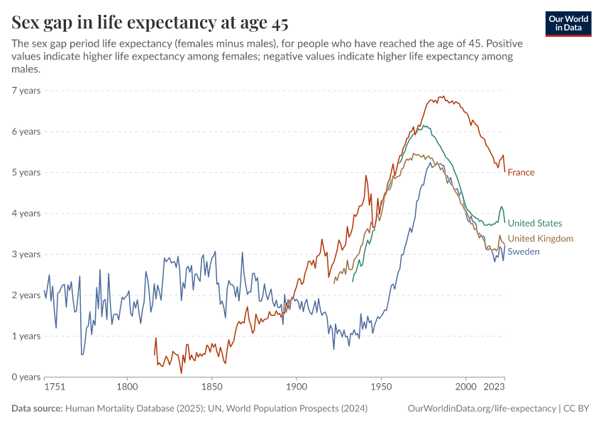 “Data Page: Life expectancy at 45”, part of the following publication: Saloni Dattani, Lucas Rodés-Guirao, Hannah Ritchie, Esteban Ortiz-Ospina, and Max Roser (2023) - “Life Expectancy”. Data adapted from Human Mortality Database, United Nations. Retrieved from https://index-dataset-dim.owid.pages.dev/grapher/difference-in-female-and-male-life-expectancy-at-age-45 [online resource]How to cite this data