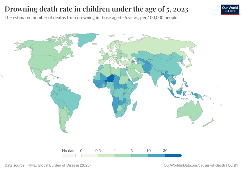 IHME, Global Burden of Disease (2024) – with minor processing by Our World in Data. “Drowning death rate in children under the age of 5” [dataset]. IHME, Global Burden of Disease, “Global Burden of Disease - Deaths and DALYs” [original data]. Retrieved February 13, 2026 from https://index-dataset-dim.owid.pages.dev/grapher/drowning-death-rates-under-5