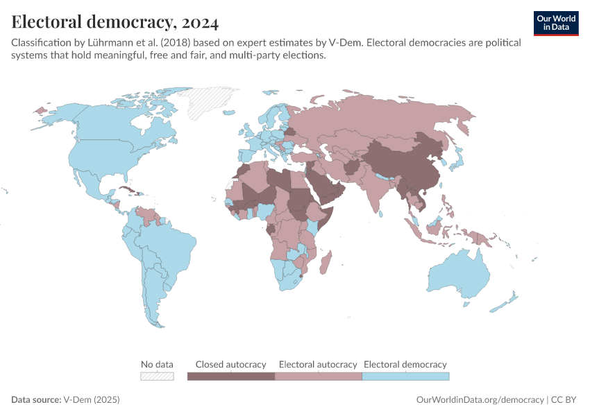 “Data Page: Political regime”, part of the following publication: Bastian Herre, Lucas Rodés-Guirao, and Esteban Ortiz-Ospina (2013) - “Democracy”. Data adapted from V-Dem. Retrieved from https://index-dataset-dim.owid.pages.dev/grapher/electoral-democracy-row [online resource]How to cite this data