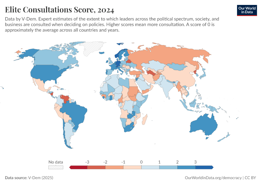 “Data Page: Elite consultation”, part of the following publication: Bastian Herre, Lucas Rodés-Guirao, and Esteban Ortiz-Ospina (2013) - “Democracy”. Data adapted from V-Dem. Retrieved from https://index-dataset-dim.owid.pages.dev/grapher/elite-consultations-score [online resource]How to cite this data