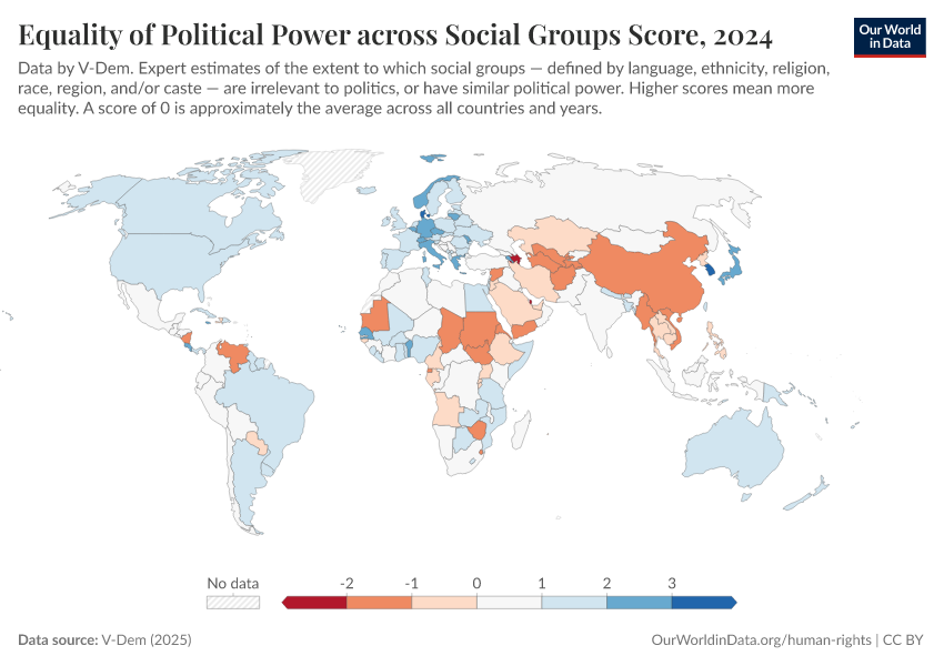 “Data Page: Equality of political power across social groups”, part of the following publication: Bastian Herre, Lucas Rodés-Guirao, and Esteban Ortiz-Ospina (2013) - “Democracy”. Data adapted from V-Dem. Retrieved from https://index-dataset-dim.owid.pages.dev/grapher/equality-of-political-power-across-social-groups-score [online resource]How to cite this data