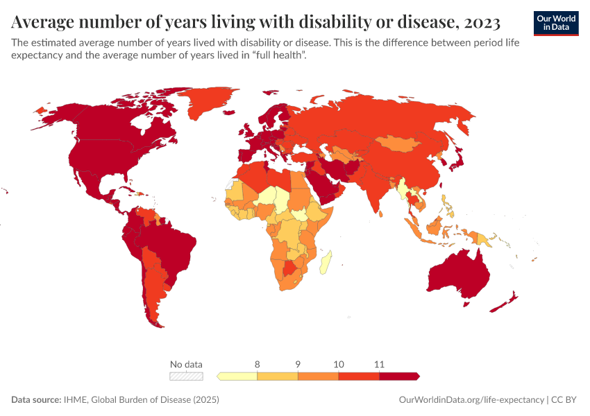 “Data Page: Average number of years living with disability or disease”, part of the following publication: Saloni Dattani, Lucas Rodés-Guirao, Hannah Ritchie, Esteban Ortiz-Ospina, and Max Roser (2023) - “Life Expectancy”. Data adapted from IHME, Global Burden of Disease. Retrieved from https://index-dataset-dim.owid.pages.dev/grapher/expected-years-of-living-with-disability-or-disease-burden [online resource]How to cite this data