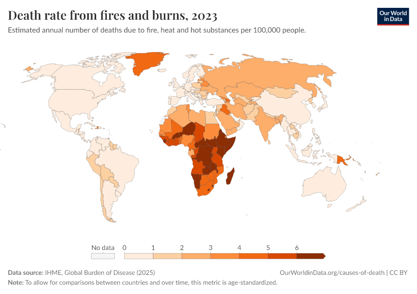 IHME, Global Burden of Disease (2024) – with minor processing by Our World in Data. “Death rate from fires and burns” [dataset]. IHME, Global Burden of Disease, “Global Burden of Disease - Deaths and DALYs” [original data]. Retrieved February 13, 2026 from https://index-dataset-dim.owid.pages.dev/grapher/fire-death-rates