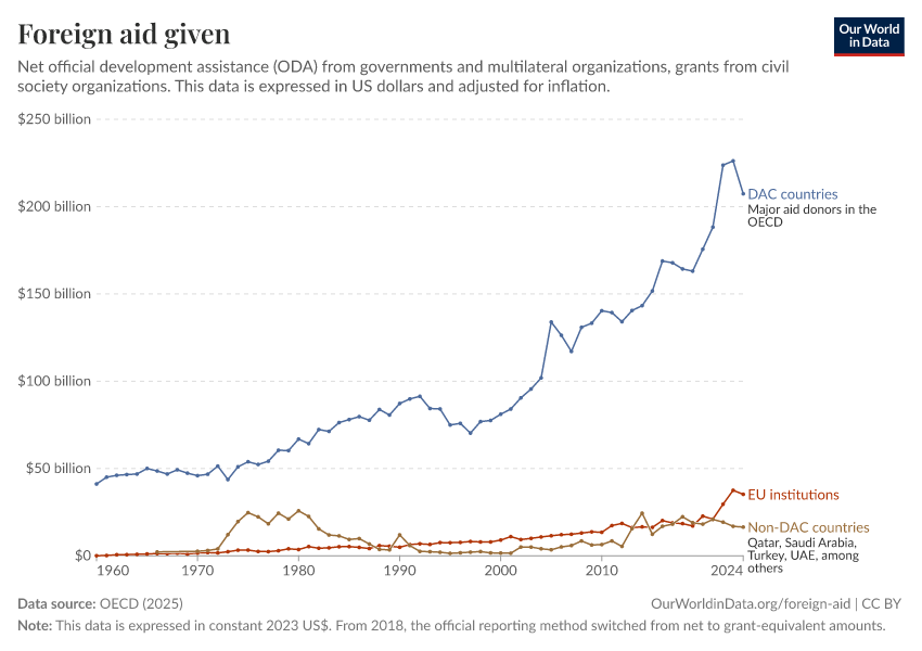 OECD (2025) – with major processing by Our World in Data. “Foreign aid given – Net disbursements” [dataset]. OECD, “OECD Official Development Assistance (ODA) - DAC1: Flows by provider (ODA+OOF+Private)”; OECD, “OECD Official Development Assistance (ODA) - DAC2A: Aid (ODA) disbursements to countries and regions” [original data]. Retrieved February 13, 2026 from https://index-dataset-dim.owid.pages.dev/grapher/foreign-aid-given-net