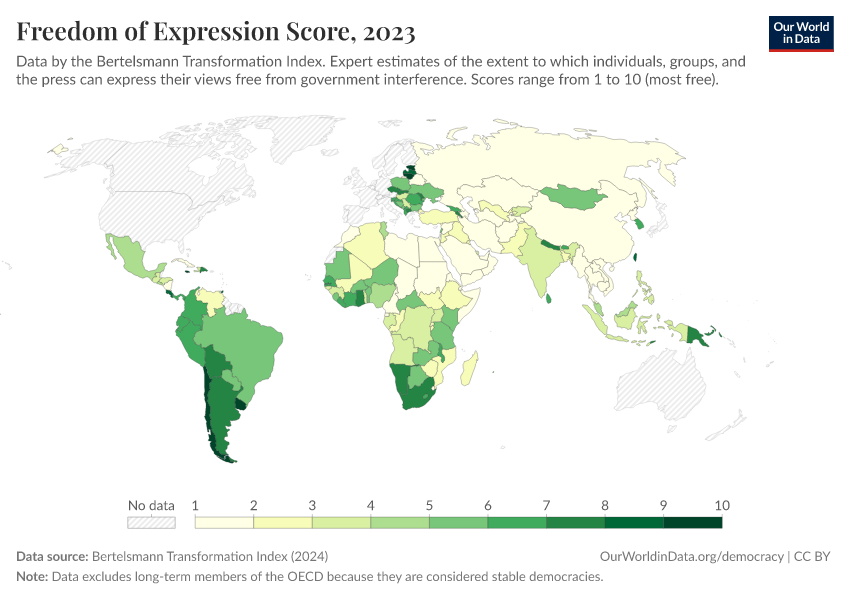“Data Page: Freedom of expression score”, part of the following publication: Bastian Herre, Lucas Rodés-Guirao, and Esteban Ortiz-Ospina (2013) - “Democracy”. Data adapted from Bertelsmann Transformation Index. Retrieved from https://index-dataset-dim.owid.pages.dev/grapher/freedom-of-expression-score-bti [online resource]How to cite this data