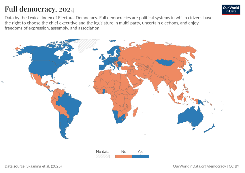 Skaaning et al. (2025) – processed by Our World in Data. “Full democracy” [dataset]. Skaaning et al., “Lexical Index of Electoral Democracy (LIED) v6.8” [original data]. Retrieved February 13, 2026 from https://index-dataset-dim.owid.pages.dev/grapher/full-democracy-lexical
