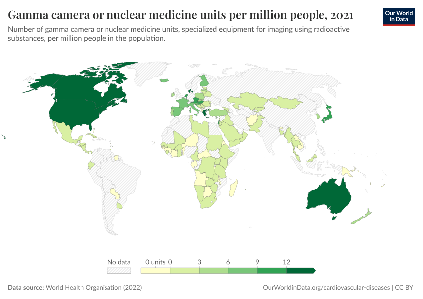 “Data Page: Gamma camera or nuclear medicine units per million people”, part of the following publication: Saloni Dattani, Veronika Samborska, Hannah Ritchie, and Max Roser (2023) - “Cardiovascular Diseases”. Data adapted from World Health Organisation. Retrieved from https://index-dataset-dim.owid.pages.dev/grapher/gamma-camera-or-nuclear-medicine-availability [online resource]How to cite this data