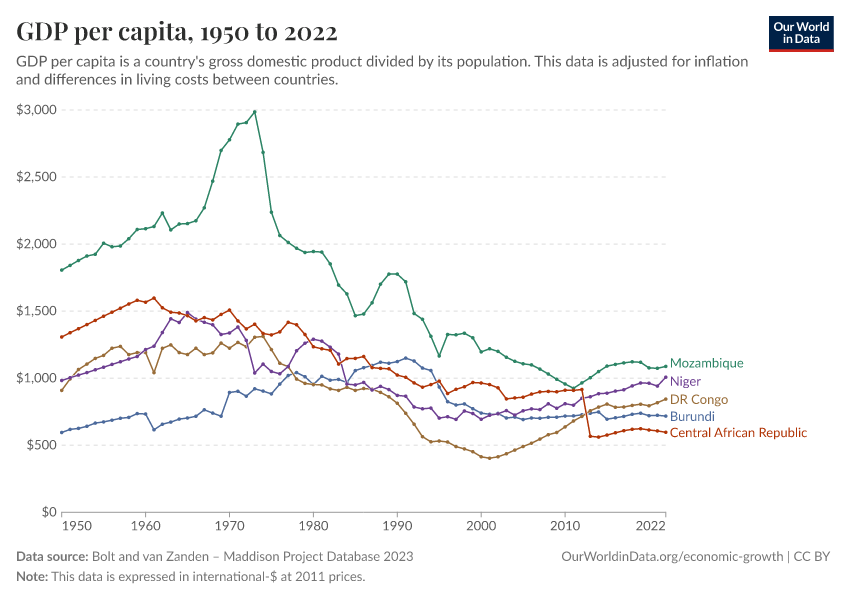 “Data Page: GDP per capita”, part of the following publication: Max Roser, Bertha Rohenkohl, Pablo Arriagada, Joe Hasell, Hannah Ritchie, and Esteban Ortiz-Ospina (2023) - “Economic Growth”. Data adapted from Bolt and van Zanden. Retrieved from https://index-dataset-dim.owid.pages.dev/grapher/gdp-per-capita-maddison-project-database [online resource]