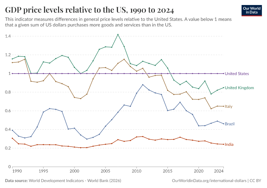 “Data Page: GDP price levels relative to the US”, part of the following publication: Max Roser, Bertha Rohenkohl, Pablo Arriagada, Joe Hasell, Hannah Ritchie, and Esteban Ortiz-Ospina (2023) - “Economic Growth”. Data adapted from World Development Indicators - World Bank. Retrieved from https://index-dataset-dim.owid.pages.dev/grapher/gdp-price-levels-relative-to-the-us [online resource]