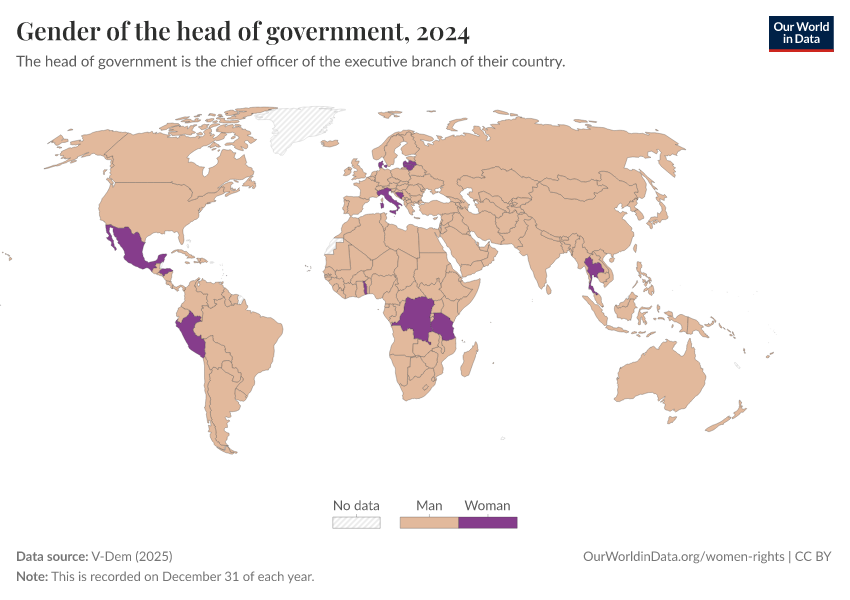 V-Dem (2025) – processed by Our World in Data. “Gender of the head of government” [dataset]. V-Dem, “Democracy report v15” [original data]. Retrieved February 13, 2026 from https://index-dataset-dim.owid.pages.dev/grapher/gender-of-the-head-of-government