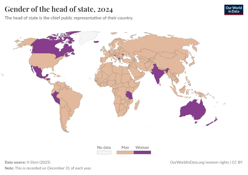 “Data Page: Gender of the head of state”, part of the following publication: Bastian Herre, Lucas Rodés-Guirao, and Esteban Ortiz-Ospina (2013) - “Democracy”. Data adapted from V-Dem. Retrieved from https://index-dataset-dim.owid.pages.dev/grapher/gender-of-the-head-of-state [online resource]How to cite this data