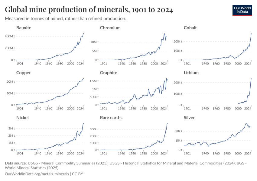 USGS - Mineral Commodity Summaries (2025); USGS - Historical Statistics for Mineral and Material Commodities (2024); BGS - World Mineral Statistics (2025) – with major processing by Our World in Data. “Global mine production of minerals” [dataset]. United States Geological Survey, “Mineral Commodity Summaries”; United States Geological Survey, “Historical Statistics for Mineral and Material Commodities”; British Geological Survey, “World Mineral Statistics” [original data]. Retrieved February 13, 2026 from https://index-dataset-dim.owid.pages.dev/grapher/global-mine-production-minerals