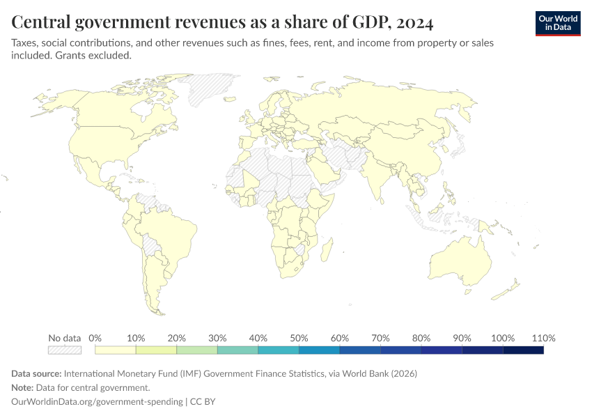 “Data Page: Central government revenues as a share of GDP”. Our World in Data (2026). Data adapted from International Monetary Fund (IMF) Government Finance Statistics, via World Bank. Retrieved from https://index-dataset-dim.owid.pages.dev/grapher/government-revenues-as-a-share-of-gdp-world-bank [online resource]How to cite this data