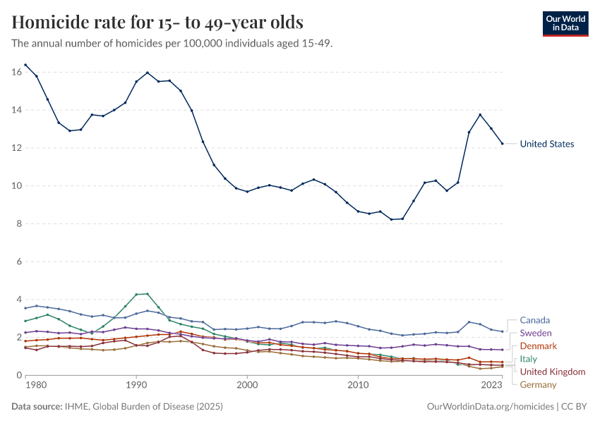 “Data Page: Homicide rate for 15- to 49-year olds”, part of the following publication: Esteban Ortiz-Ospina and Max Roser (2016) - “Global Health”. Data adapted from IHME, Global Burden of Disease. Retrieved from https://index-dataset-dim.owid.pages.dev/grapher/homicide-rate-in-15--to-49-year-olds [online resource]How to cite this data