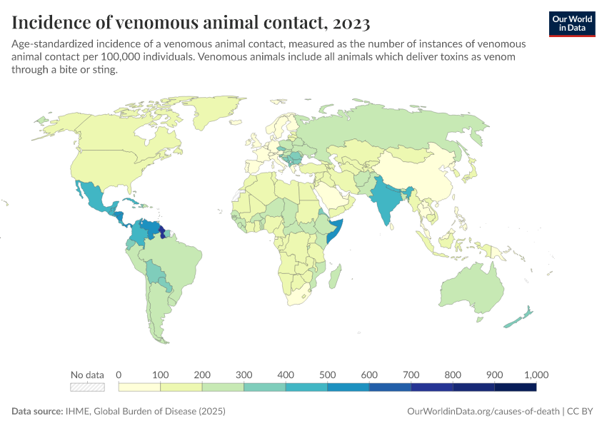 “Data Page: Incidence of venomous animal contact”, part of the following publication: Esteban Ortiz-Ospina and Max Roser (2016) - “Global Health”. Data adapted from IHME, Global Burden of Disease. Retrieved from https://index-dataset-dim.owid.pages.dev/grapher/incidence-of-venomous-animal-contact [online resource]How to cite this data