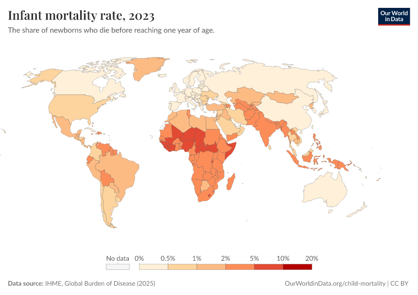 IHME, Global Burden of Disease (2024) – with minor processing by Our World in Data. “Infant mortality rate” [dataset]. IHME, Global Burden of Disease, “Global Burden of Disease - Child Mortality” [original data]. Retrieved February 13, 2026 from https://index-dataset-dim.owid.pages.dev/grapher/infant-mortality-rate