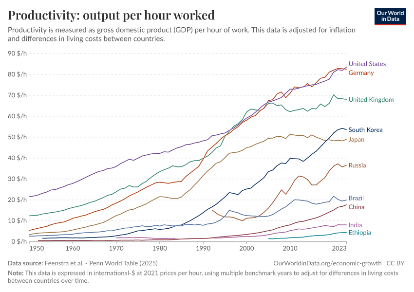 “Data Page: Productivity: output per hour worked”, part of the following publication: Max Roser, Bertha Rohenkohl, Pablo Arriagada, Joe Hasell, Hannah Ritchie, and Esteban Ortiz-Ospina (2023) - “Economic Growth”. Data adapted from Feenstra et al.. Retrieved from https://index-dataset-dim.owid.pages.dev/grapher/labor-productivity-per-hour-pennworldtable [online resource]
