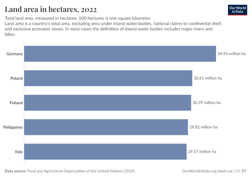 “Data Page: Land area in hectares”, part of the following publication: Hannah Ritchie, Pablo Rosado, and Max Roser (2023) - “Agricultural Production”. Data adapted from Food and Agriculture Organization of the United Nations. Retrieved from https://index-dataset-dim.owid.pages.dev/grapher/land-area-hectares [online resource]How to cite this data