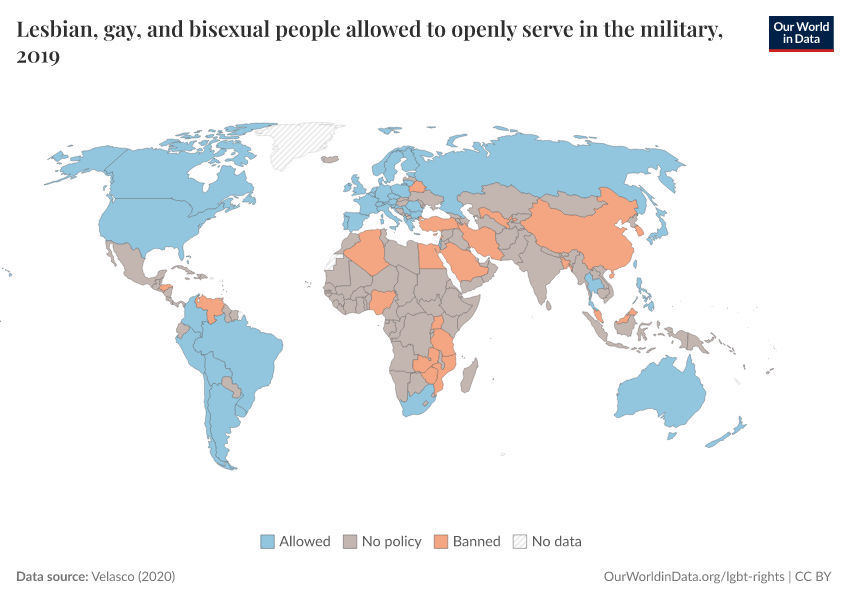 “Data Page: Lesbian, gay, and bisexual people allowed to openly serve in the military”, part of the following publication: Bastian Herre and Pablo Arriagada (2023) - “LGBT+ Rights”. Data adapted from Velasco. Retrieved from https://index-dataset-dim.owid.pages.dev/grapher/lgb-military-velasco [online resource]How to cite this data