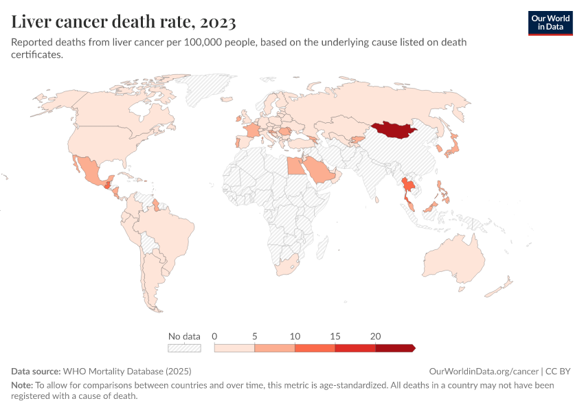 “Data Page: Liver cancer death rate”, part of the following publication: Saloni Dattani, Fiona Spooner, Hannah Ritchie, and Max Roser (2023) - “Causes of Death”. Data adapted from WHO Mortality Database. Retrieved from https://index-dataset-dim.owid.pages.dev/grapher/liver-cancer-death-rate [online resource]How to cite this data