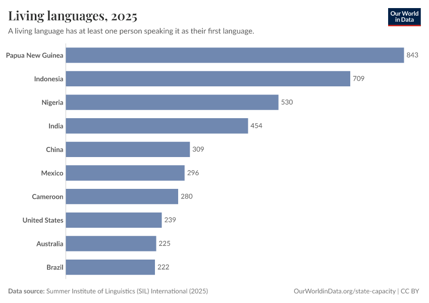 “Data Page: Living languages”, part of the following publication: Bastian Herre and Pablo Arriagada (2023) - “State Capacity”. Data adapted from Summer Institute of Linguistics (SIL) International. Retrieved from https://index-dataset-dim.owid.pages.dev/grapher/living-languages [online resource]How to cite this data