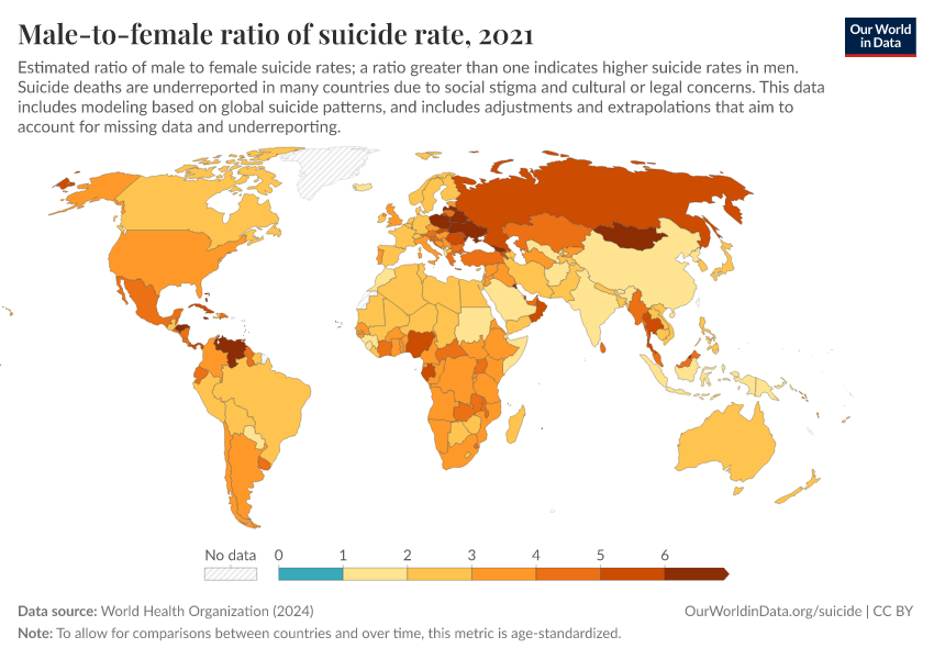 World Health Organization (2024) – with major processing by Our World in Data. “Male-to-female ratio of suicide rate” [dataset]. World Health Organization, “Global Health Estimates” [original data]. Retrieved February 13, 2026 from https://index-dataset-dim.owid.pages.dev/grapher/male-female-ratio-suicides-rates
