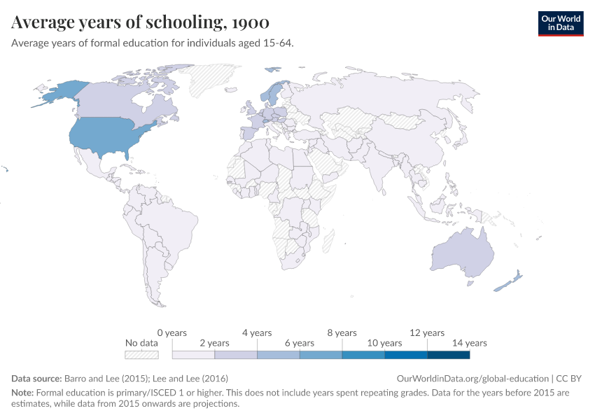Barro and Lee (2015); Lee and Lee (2016) – with major processing by Our World in Data. “Average years of schooling” [dataset]. Barro and Lee, “Projections of Educational Attainment”; Lee and Lee, “Human Capital in the Long Run” [original data]. Retrieved February 13, 2026 from https://index-dataset-dim.owid.pages.dev/grapher/mean-years-of-schooling-long-run