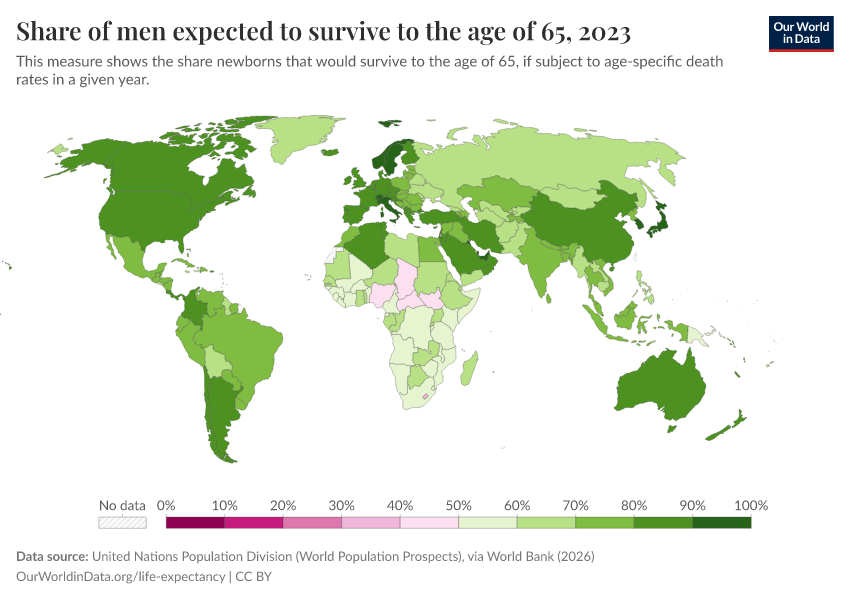 “Data Page: Share of men expected to survive to the age of 65”. Our World in Data (2026). Data adapted from United Nations Population Division (World Population Prospects), via World Bank. Retrieved from https://index-dataset-dim.owid.pages.dev/grapher/men-survival-to-age-65 [online resource]How to cite this data