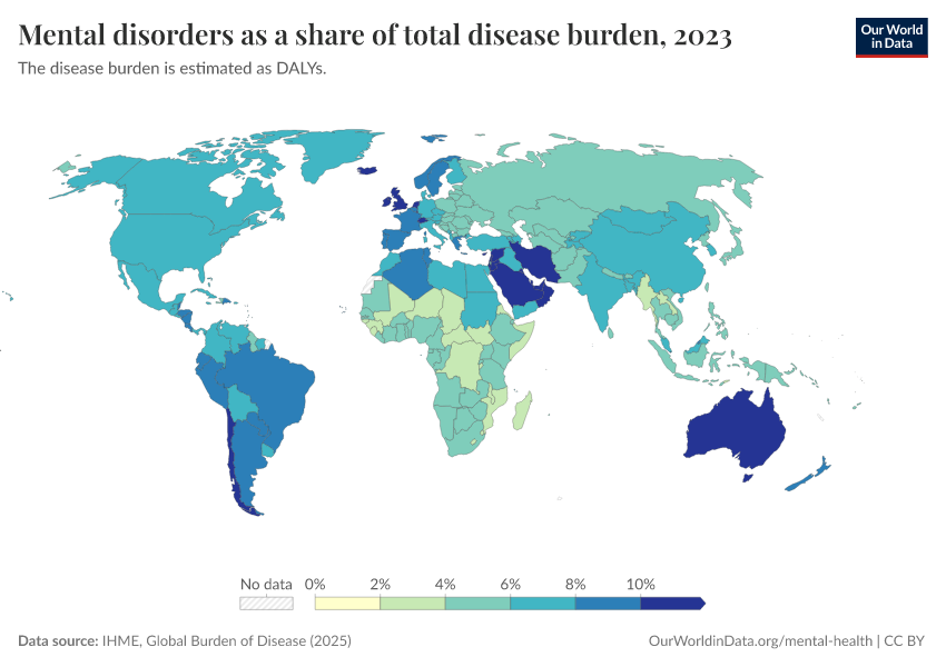IHME, Global Burden of Disease (2024) – with minor processing by Our World in Data. “Mental disorders as a share of total disease burden” [dataset]. IHME, Global Burden of Disease, “Global Burden of Disease - Deaths and DALYs” [original data]. Retrieved February 13, 2026 from https://index-dataset-dim.owid.pages.dev/grapher/mental-and-substance-use-as-share-of-disease