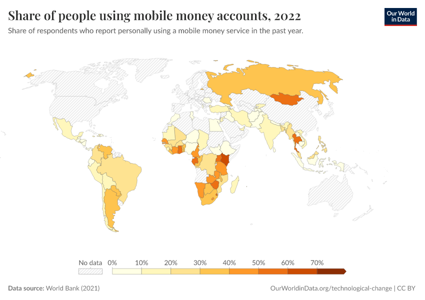 “Data Page: Share of people using mobile money accounts”, part of the following publication: Max Roser, Bertha Rohenkohl, Pablo Arriagada, Joe Hasell, Hannah Ritchie, and Esteban Ortiz-Ospina (2023) - “Economic Growth”. Data adapted from World Bank. Retrieved from https://index-dataset-dim.owid.pages.dev/grapher/mobile-money-account-usage [online resource]How to cite this data