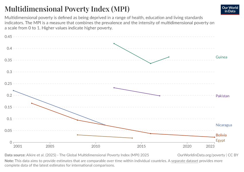Alkire et al. (2025) - The Global Multidimensional Poverty Index (MPI) 2025 – with minor processing by Our World in Data. “Multidimensional Poverty Index (MPI) – Harmonized over time” [dataset]. Alkire et al., “Global Multidimensional Poverty Index (MPI) 2025” [original data]. Retrieved February 13, 2026 from https://index-dataset-dim.owid.pages.dev/grapher/multidimensional-poverty-index-mpi-hot