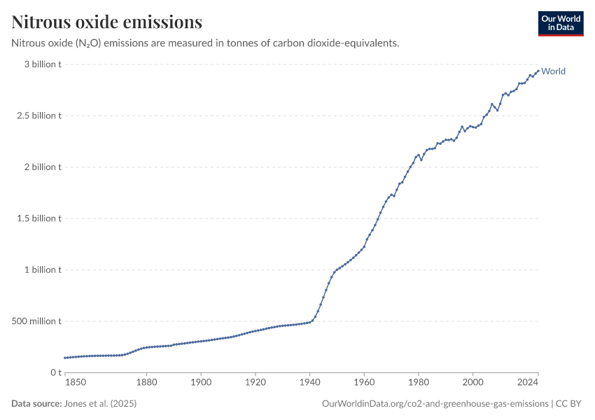 Jones et al. (2025) – with major processing by Our World in Data. “Annual nitrous oxide emissions including land use” [dataset]. Jones et al., “National contributions to climate change 2025.1” [original data]. Retrieved February 13, 2026 from https://index-dataset-dim.owid.pages.dev/grapher/nitrous-oxide-emissions