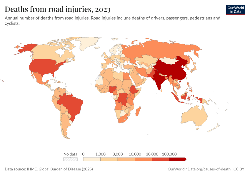 IHME, Global Burden of Disease (2024) – with minor processing by Our World in Data. “Deaths from road injuries” [dataset]. IHME, Global Burden of Disease, “Global Burden of Disease - Deaths and DALYs” [original data]. Retrieved February 13, 2026 from https://index-dataset-dim.owid.pages.dev/grapher/number-of-deaths-from-road-injuries
