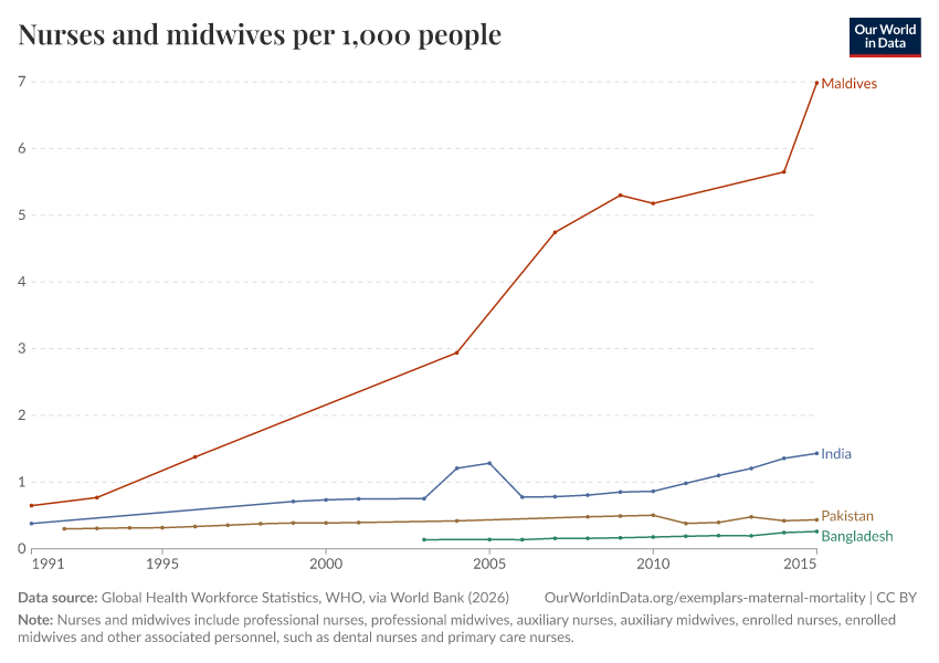 “Data Page: Nurses and midwives per 1,000 people”. Our World in Data (2026). Data adapted from World Health Organization (Global Health Workforce Statistics), OECD, and country data, via World Bank. Retrieved from https://index-dataset-dim.owid.pages.dev/grapher/nurses-and-midwives-per-1000-people [online resource]How to cite this data